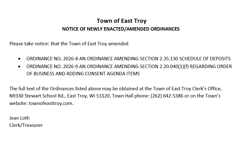 Our first notice can be viewed at: https://townofeasttroywi.gov/legal-postings/