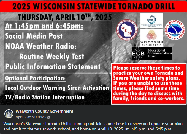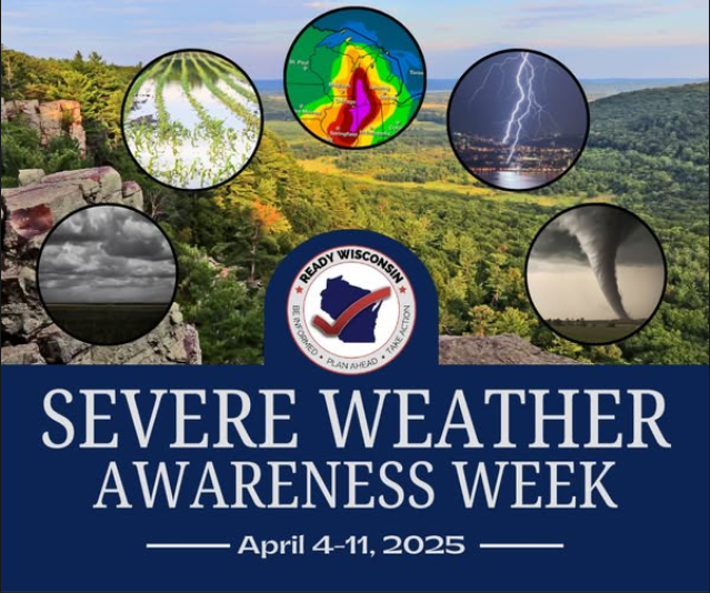 Wisconsin's Severe Weather Awareness Week is underway. Take some time to review and update your severe weather plan and put it into action with Thursday’s statewide tornado drills at 1:45 p.m. and 6:45 p.m.!