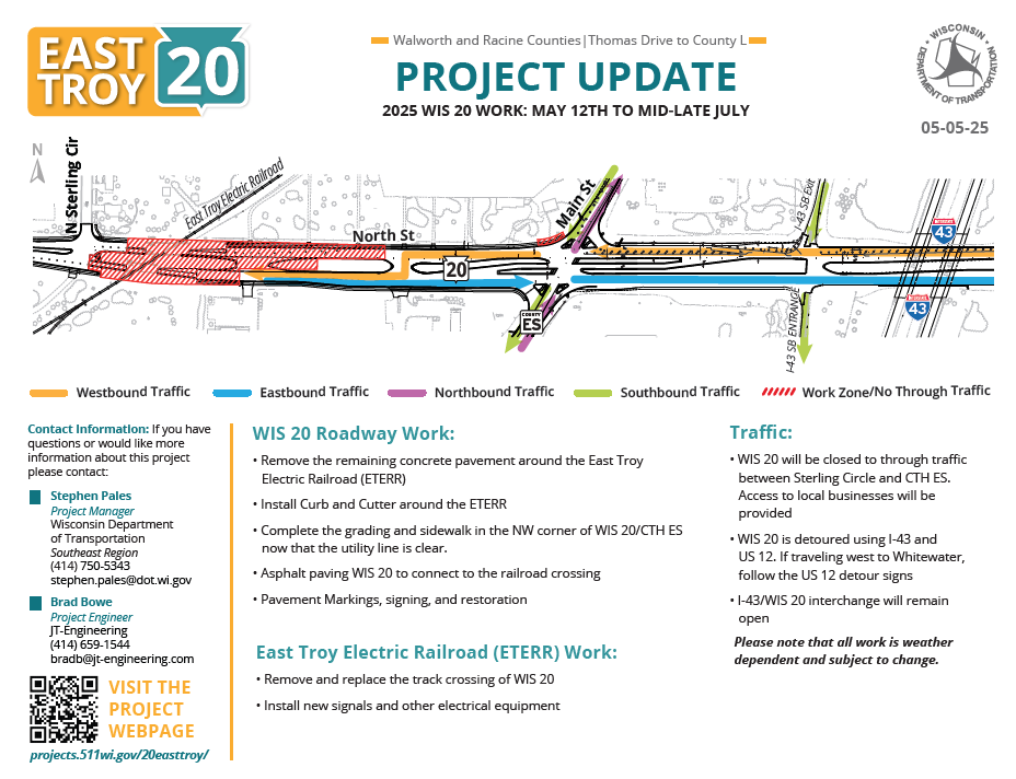 - County ES will remain open but the right turn lane for County ES SB to WIS 20 WB will close for sidewalk and grading.